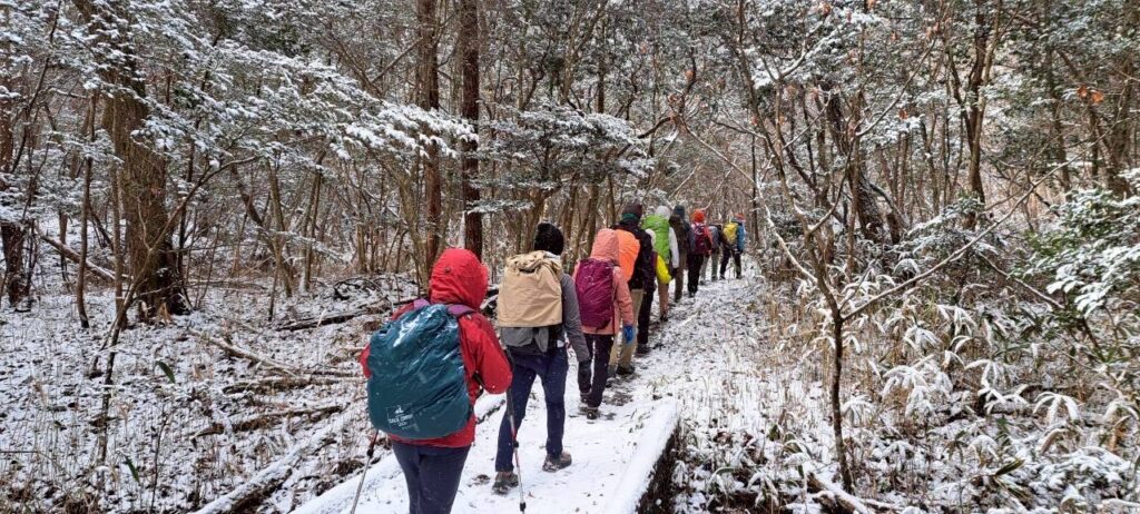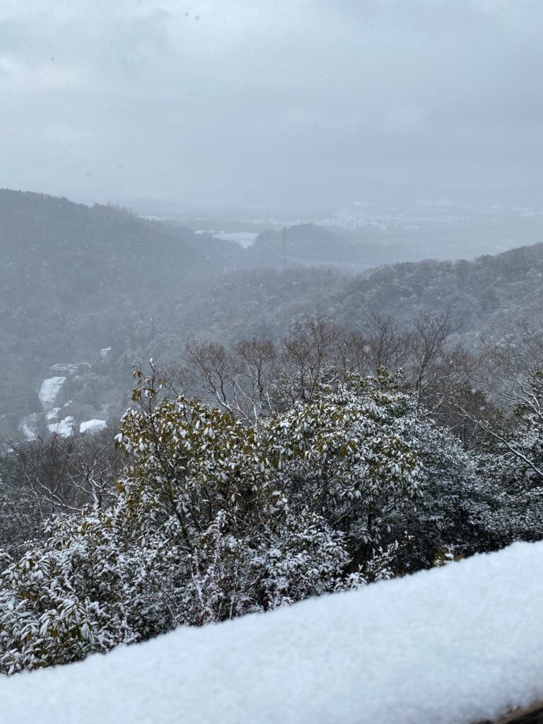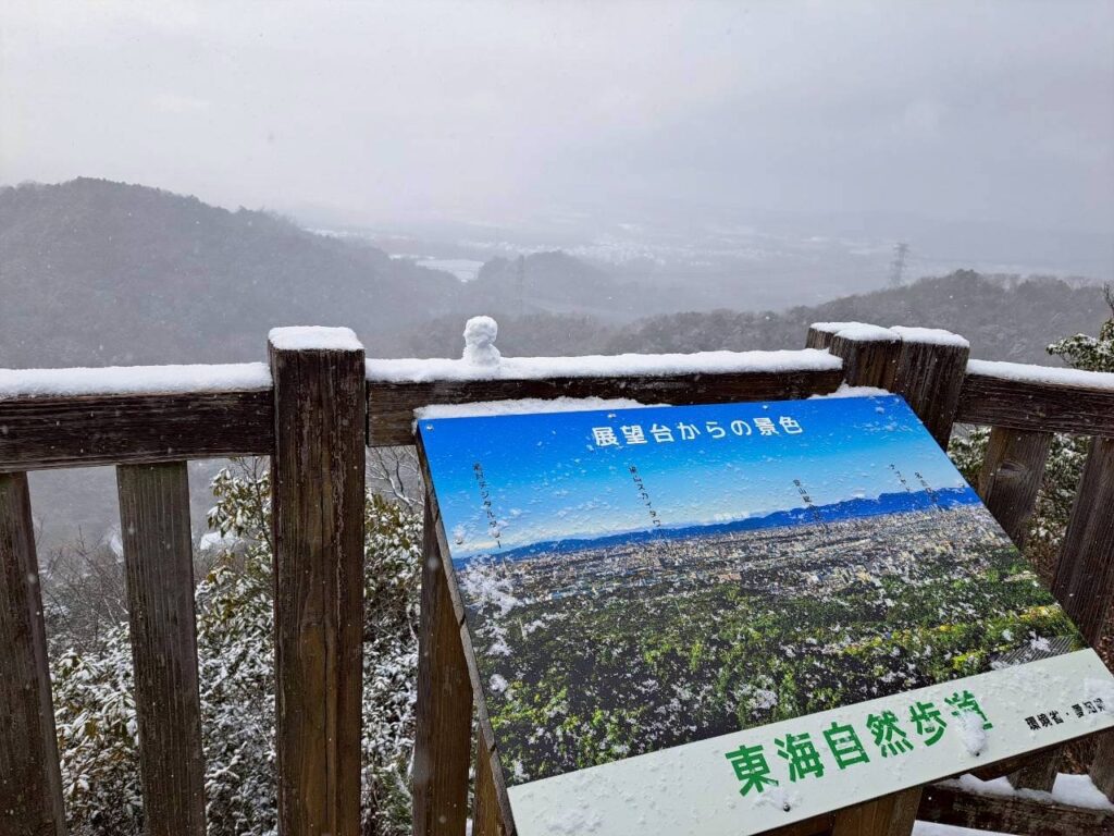 スタート地点で雪が降り始めて素晴らしい雪景色を楽しむことが出来ました。枯れ木に綿雪が積もって花が咲いてたように美しい景色でした。雪景色と青空と名古屋のビル群。楽しい山行になりました。