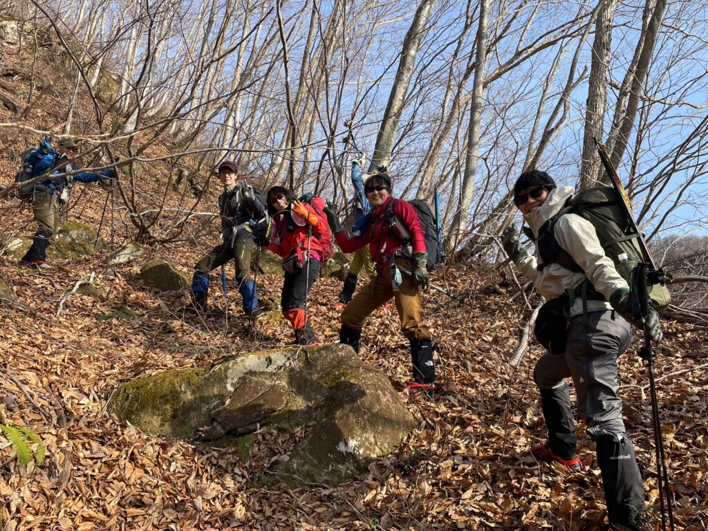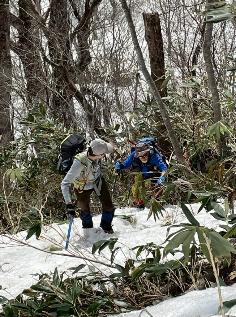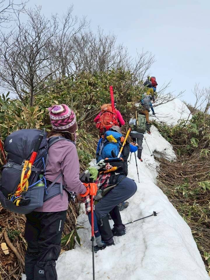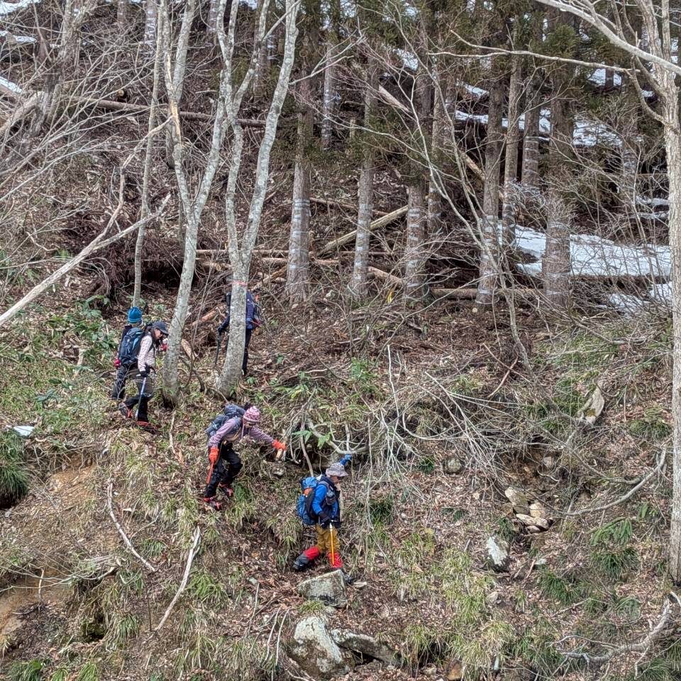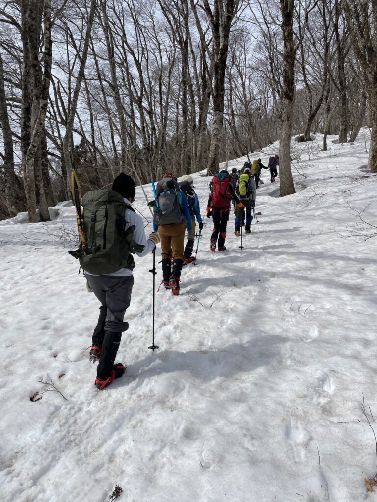 今回の14人で「バリエーション」は初体験。残雪が思ったより少なく、難易度が高くなったと思いながらヤブ漕ぎ。意見が出始める。