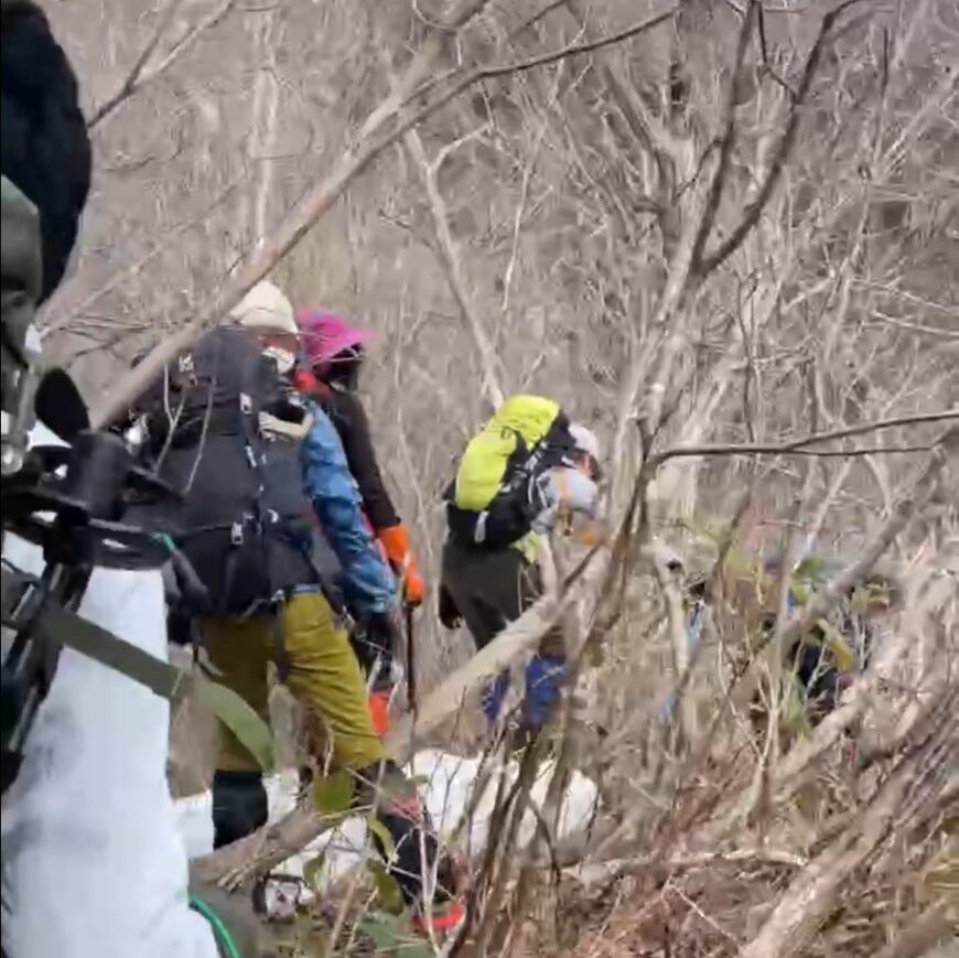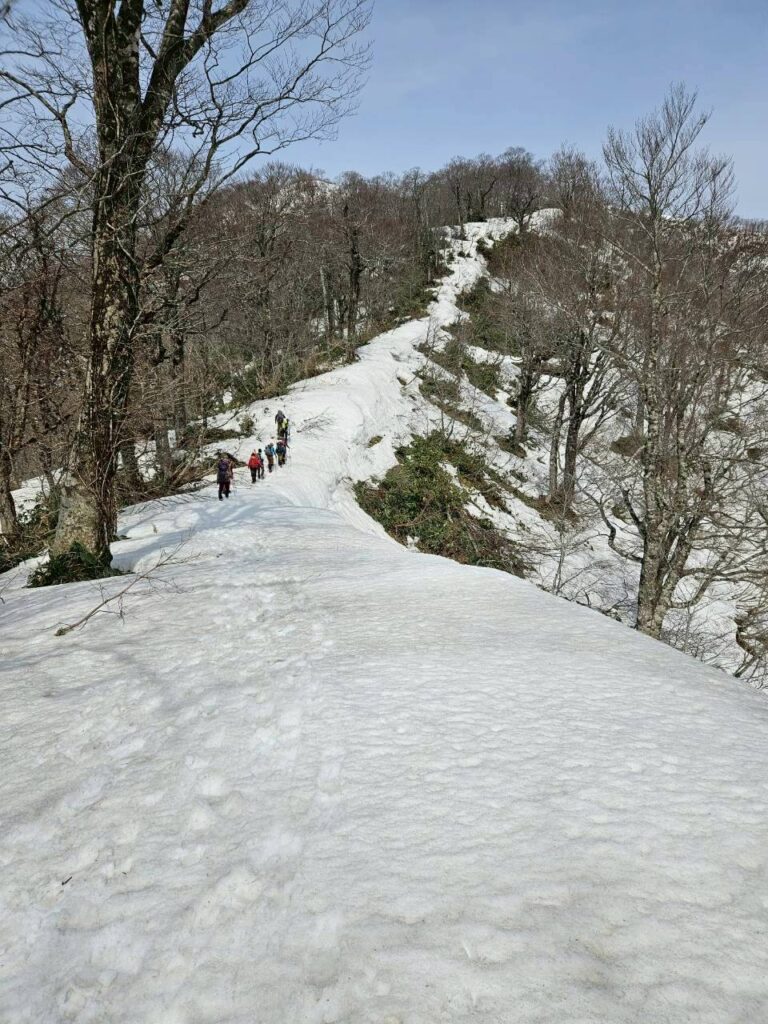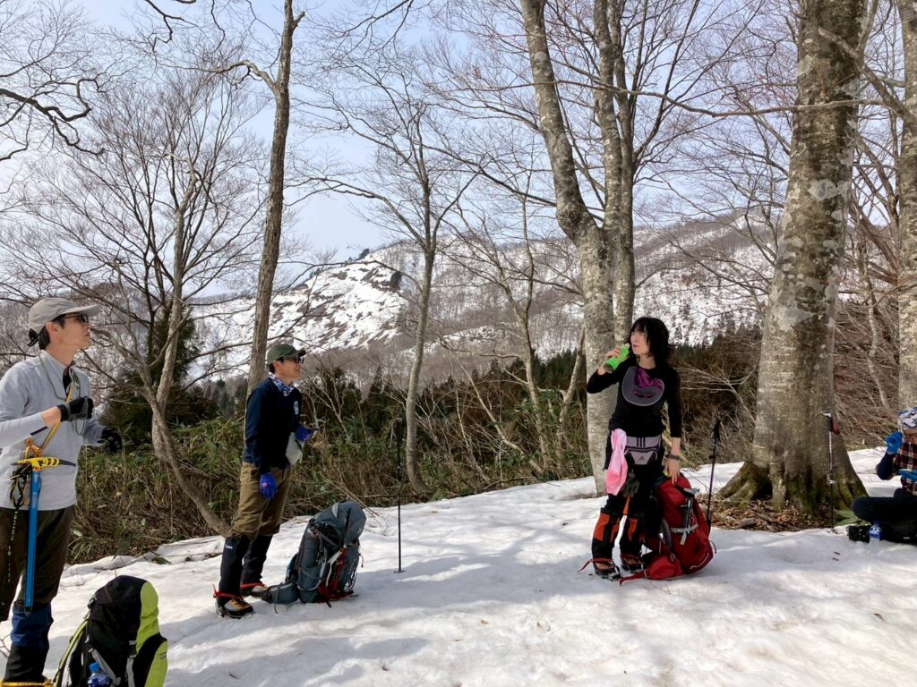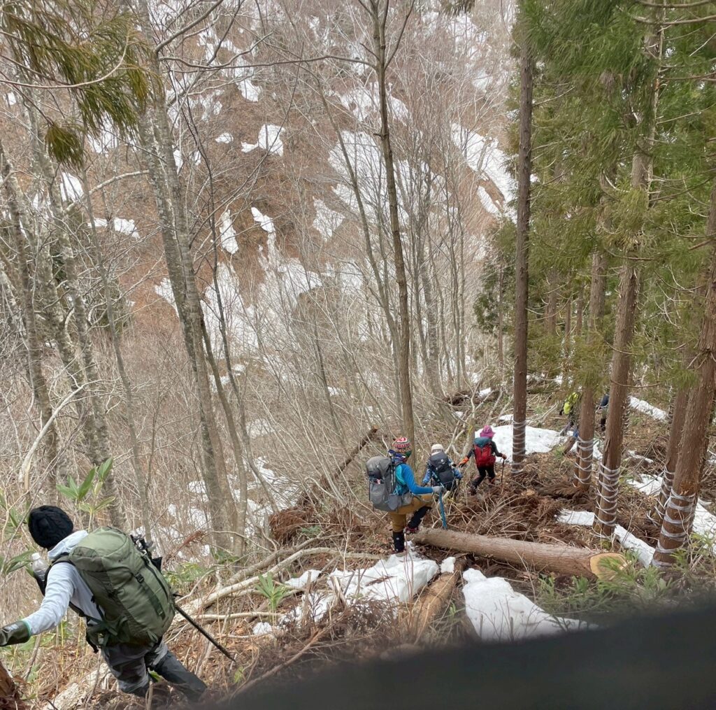 今回の14人で「バリエーション」は初体験。残雪が思ったより少なく、難易度が高くなったと思いながらヤブ漕ぎ。意見が出始める。