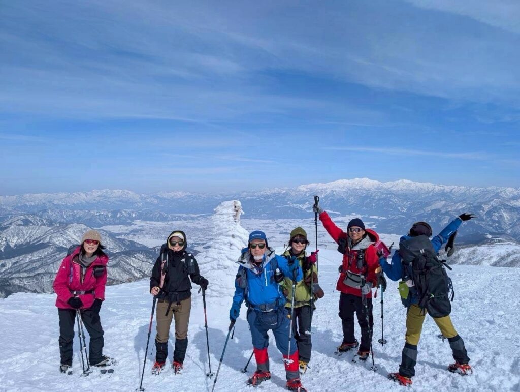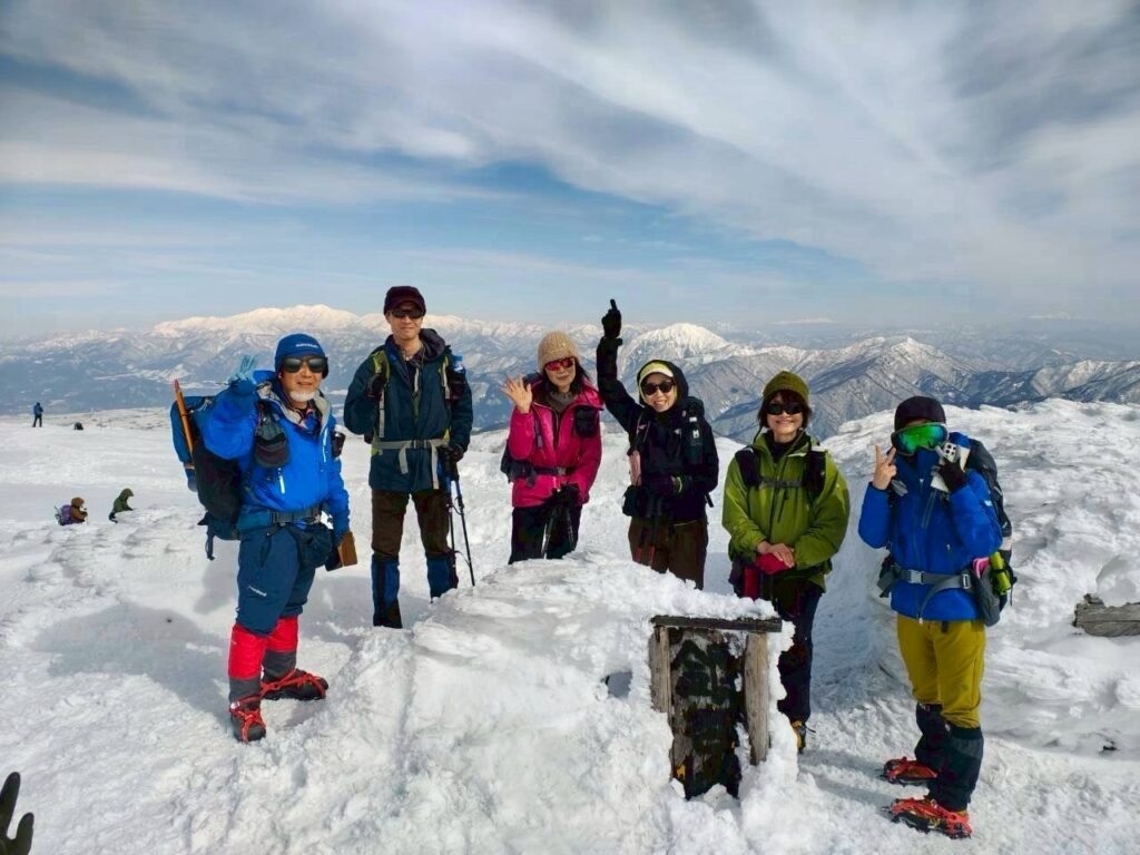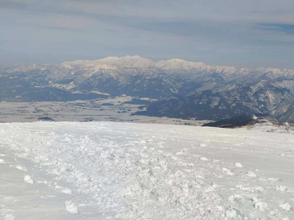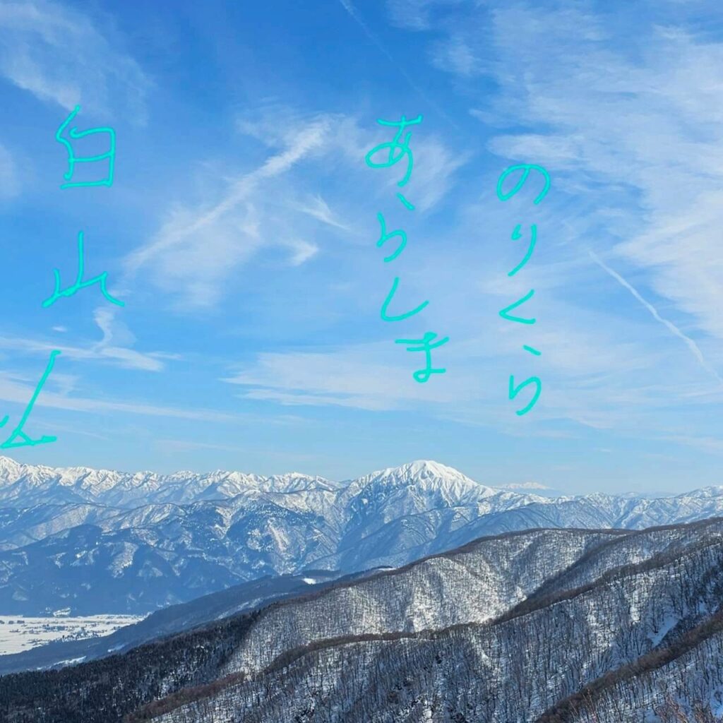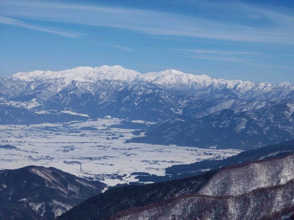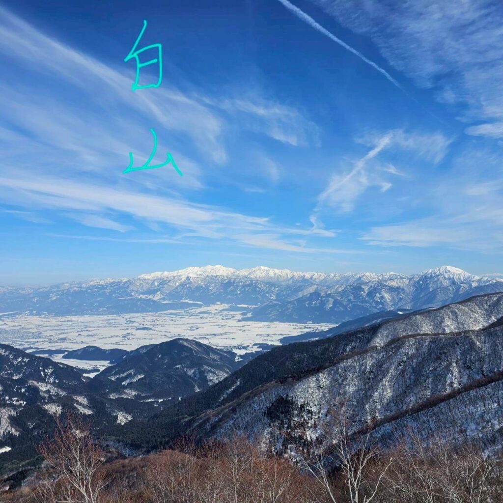 ようこそと言われてるような頂上での360度見渡し。 白さをアピールの荒島岳、御嶽山、乗鞍岳、白山、別山、雪をまとった大野盆地